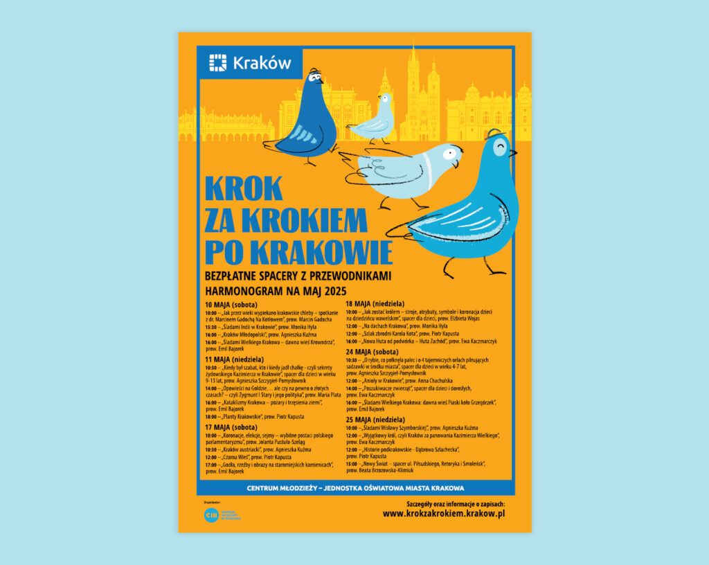 „Krok za krokiem po Krakowie” – plakat dla cyklu spacerów edukacyjnych po Krakowie organizowanych przez Centrum Młodzieży im. H Jordana